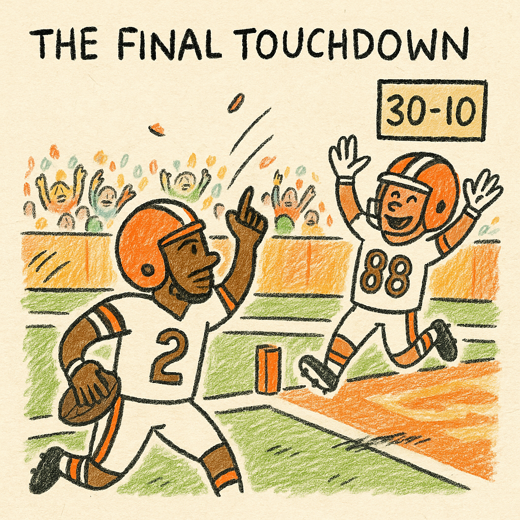 The Panthers tried to respond, but it was clear the game was over. The Browns had done it. A dominant performance from their rookie quarterback, a stellar defense, and special teams that came up big when needed. The final whistle blew, and the Browns celebrated their 30–10 victory.